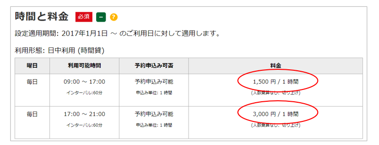 この施設の「ご利用可能な時間」や「ご利用料金」に関する設定を行えます。