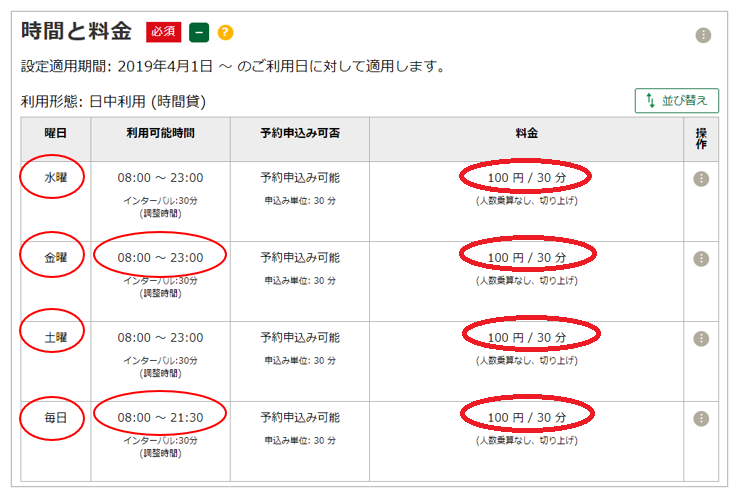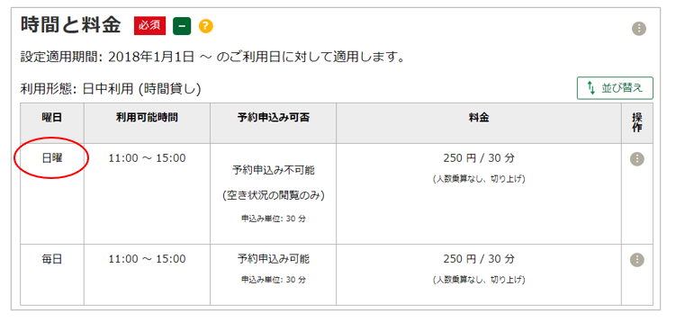 特定の「曜日」と「毎日」で、予約申込み可否の内容が異なる複数の「時間と料金」の設定を登録してください。