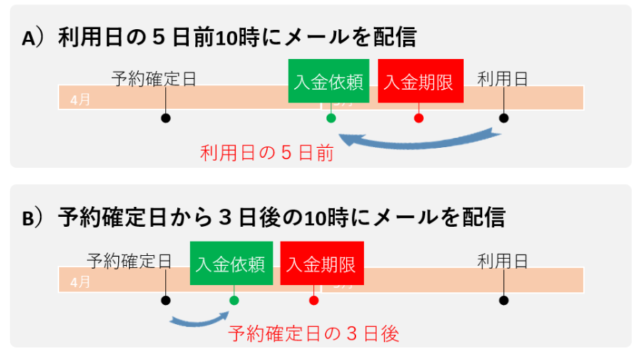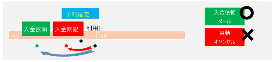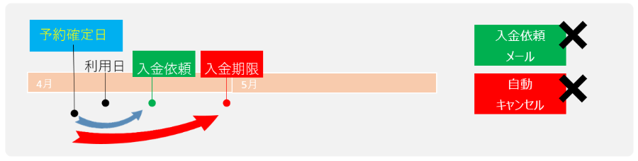 利用日の当日や前日に申込みをした場合、設定によっては、利用日よりも入金依頼メール配信日時や入金期限が未来になる場合が想定されます。この場合、入金依頼メールは配信さません。また、自動キャンセルも実行されません。