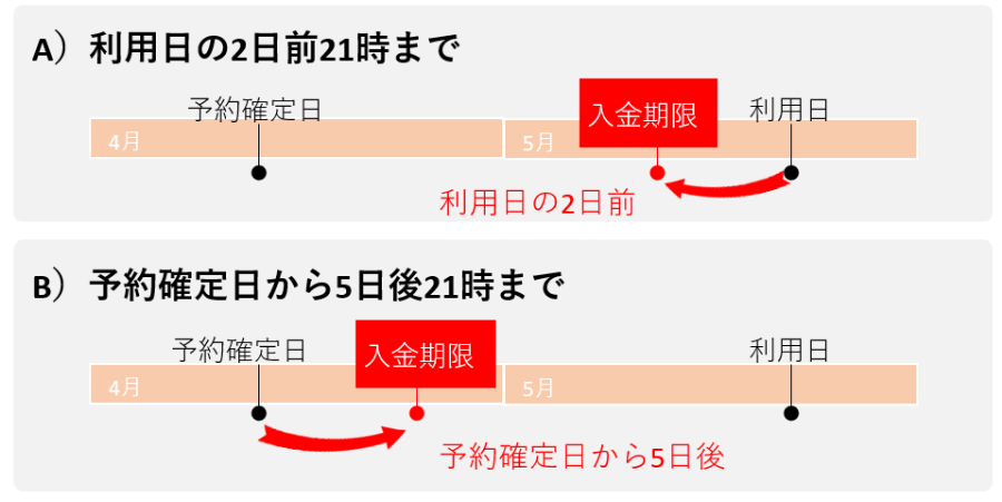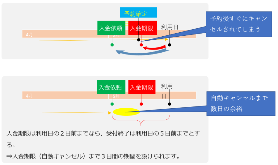 例えば、利用日の2日前15時を入金期限として設定していて、利用日2日前の14時50分に予約を申し込んだ場合、10分以内に入金処理をしないと自動キャンセルされてしまいます。