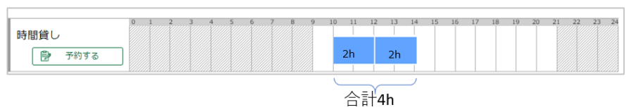 1つ目と2つ目の予約が連続するケースで、2つの予約を集約(合計)すると、計4時間となり、連続3時間の制限を超えてしまうため、2つ目は予約できません。