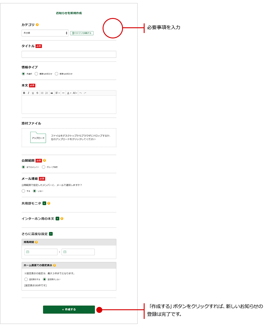 お知らせの入力画面が表示されるので、タイトルや本文などの必要事項を入力し、