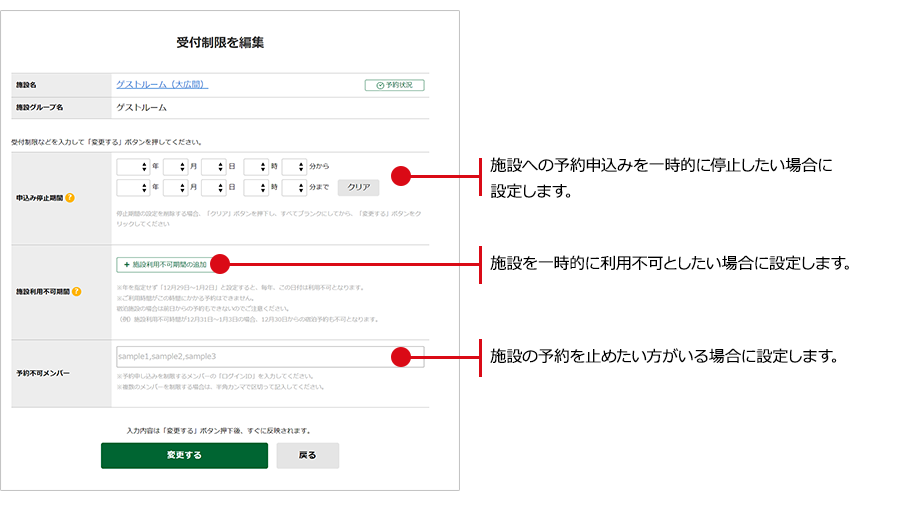 必要に応じて「申込み停止期間」「施設利用不可期間」「予約不可メンバー」「予約可能メンバー」を設定できます。