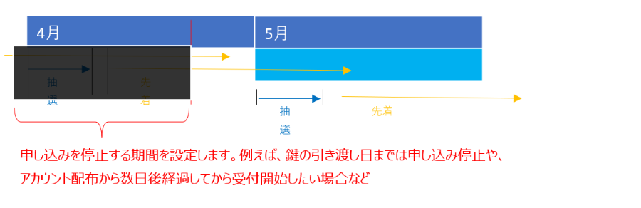 ※主に新しい施設の予約枠を設定追加して受付を開始する際に、スタートのタイミングをそろえる手段として設定します。