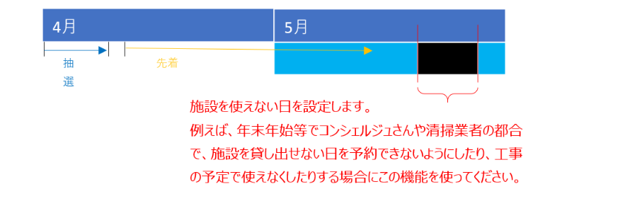 ・施設利用不可期間:施設を一時的に利用不可としたい場合、日時を登録することで、指定したご利用日の予約ができなります。
