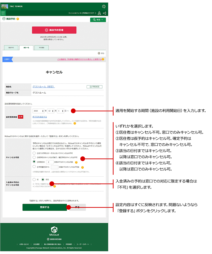 マンション共用施設の居住者権限でのキャンセル可否の設定変更が可能です。