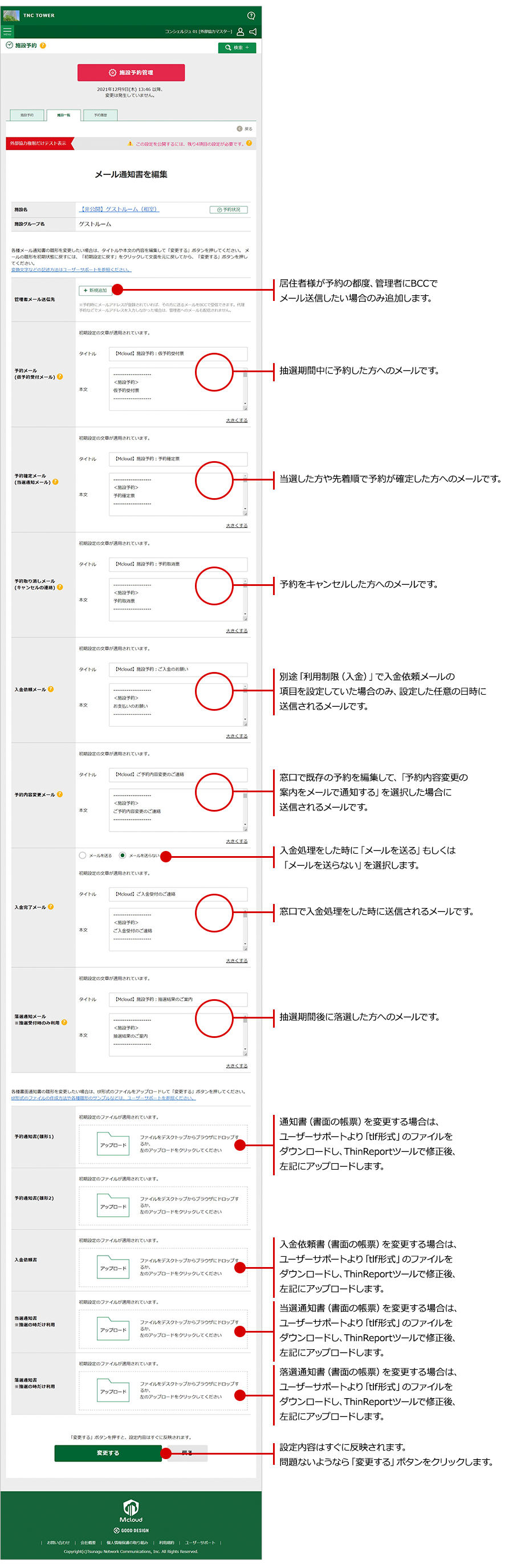 変更が必要な場合のみ、各項目で通知するメールの文言を設定します。