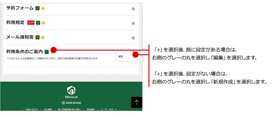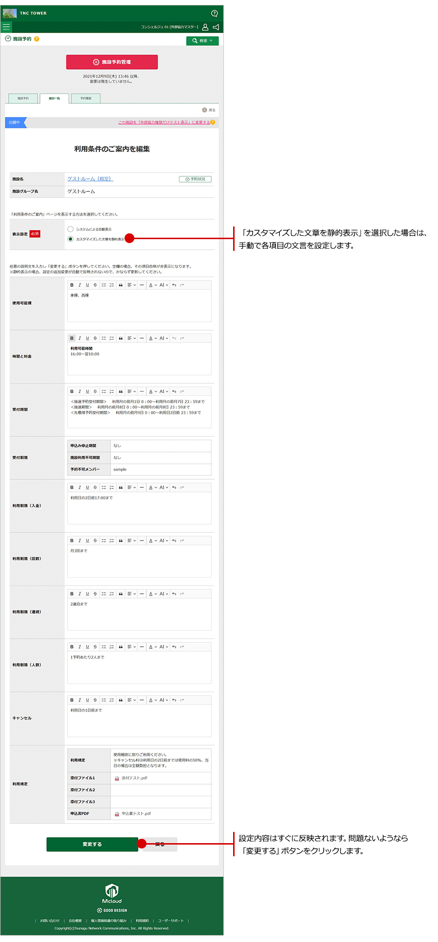「施設一覧」タブの施設詳細ページで「利用条件のご案内」の文言を変更する場合のみ設定してください。