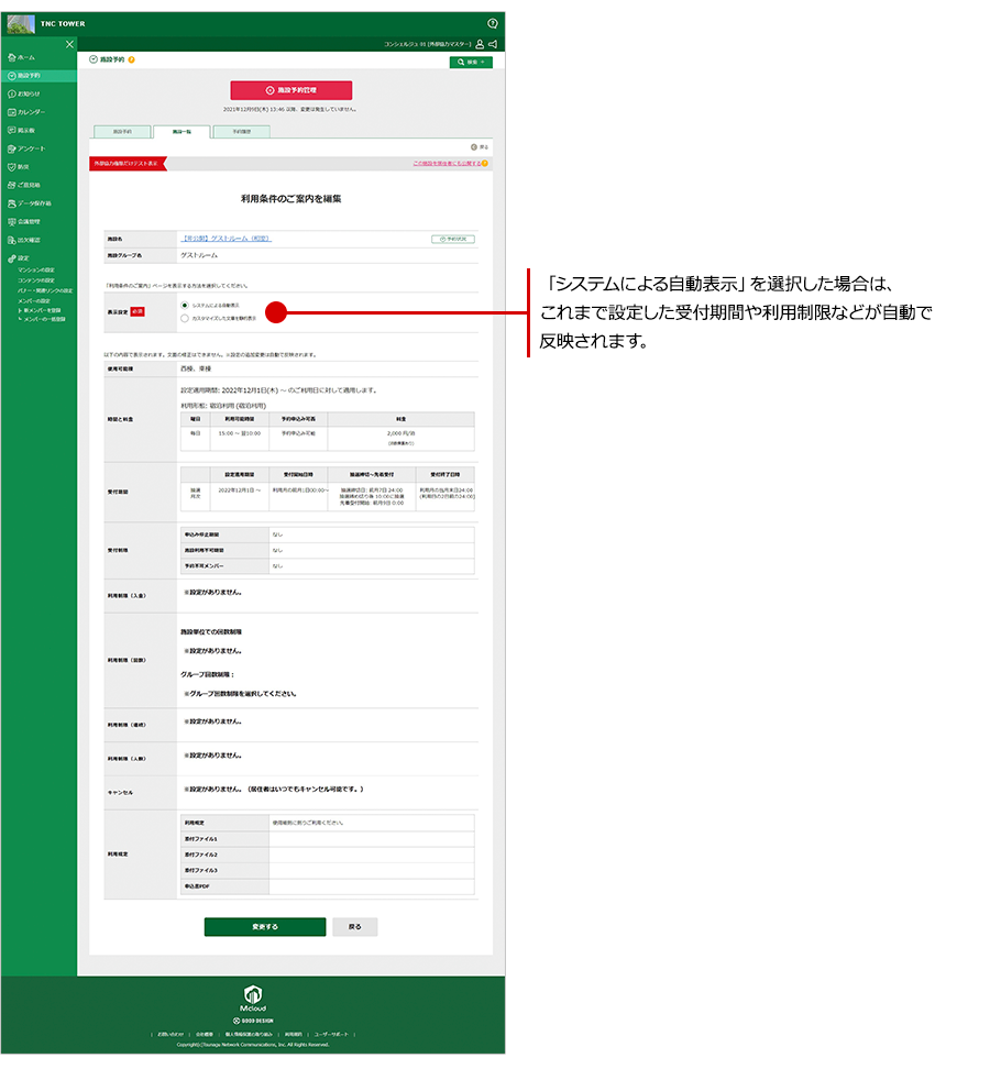 マンション共用施設の「利用条件のご案内」の設定変更が可能です。