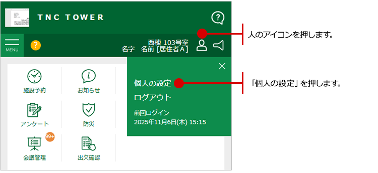 右端からサイドメニューが表示されますので、「個人の設定」をタップします。