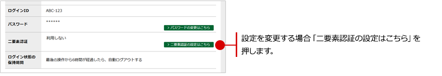 設定を変更する場合、「二要素認証の設定はこちら」ボタンを押します。
