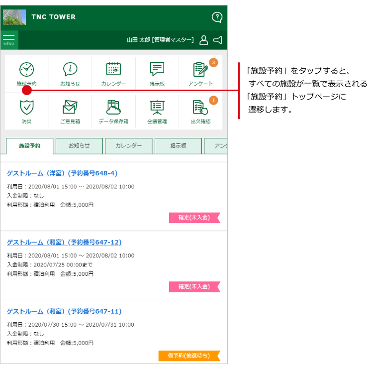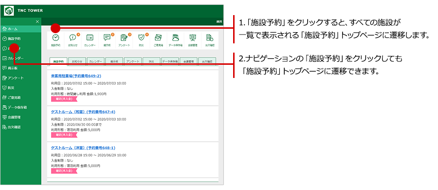 2. ナビゲーションの「施設予約」をクリックしても「施設一覧」ページに遷移できます。
