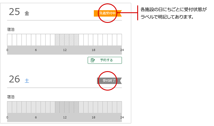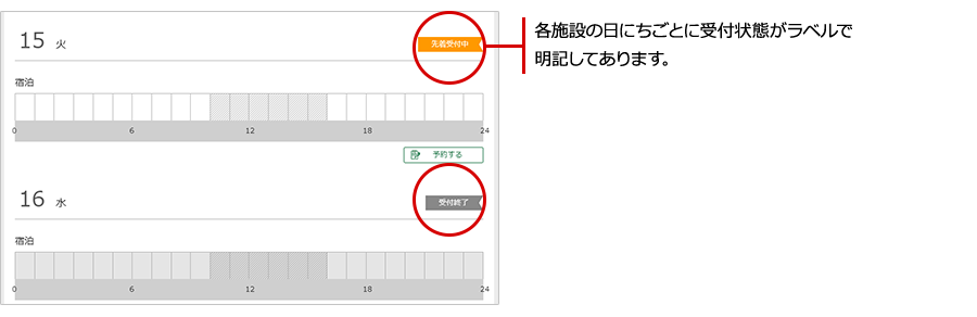 各施設の日にちごとに受付状態がラベルで明記してあります。