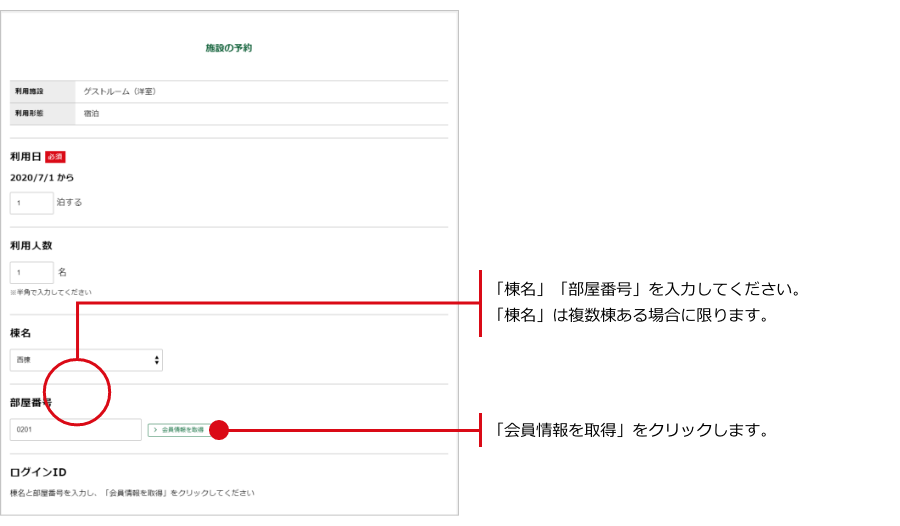 申し込みページで、(あれば「棟名」)「部屋番号」を入力した後に