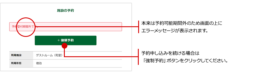 予約申し込みを続ける場合は「強制予約する」ボタンをクリックしてください。