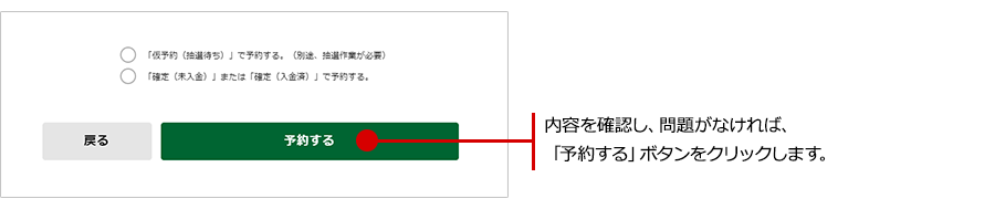 「予約する」ボタン上の【「仮予約(抽選待ち)」で予約する。(別途、抽選作業が必要)】に