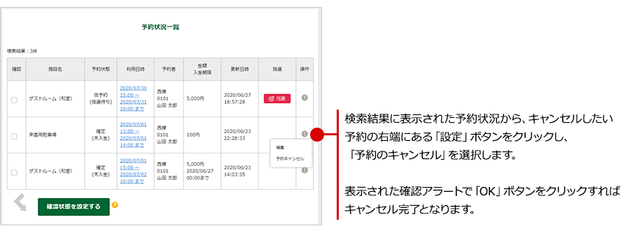 検索結果に表示された予約状況から、キャンセルしたい予約の右端にある