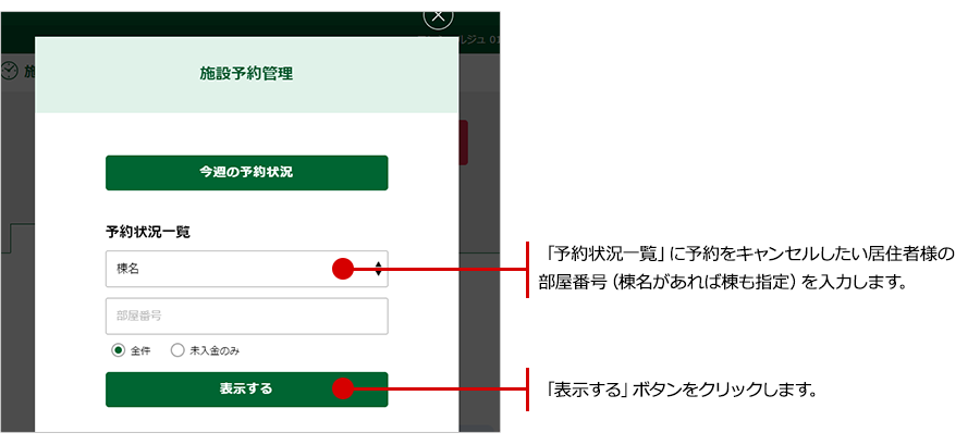 「施設予約管理」画面にある、「予約状況一覧」に予約をキャンセルしたい居住者様の