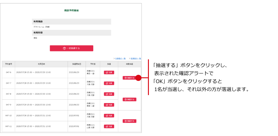 「OK」ボタンをクリックすると1名が当選し、それ以外の方が落選します。