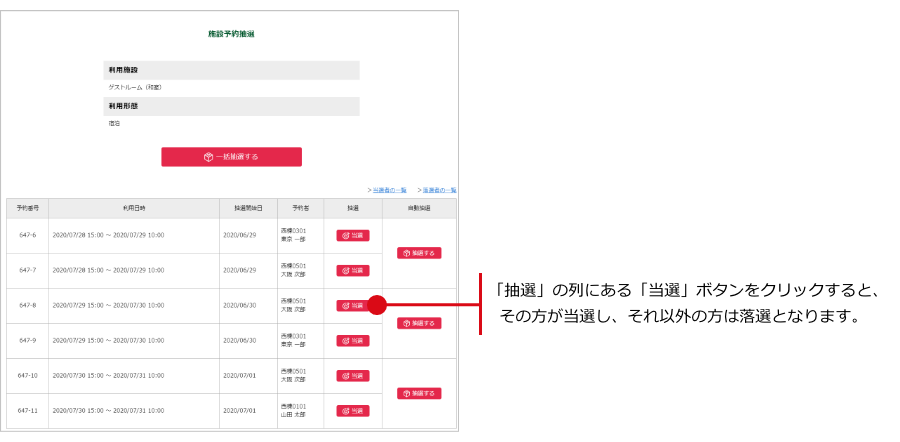 手動抽選は、利用日、利用施設ごとに1件ずつ手動で抽選させる方法です。