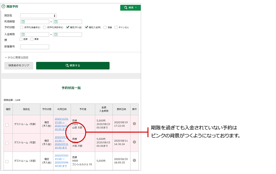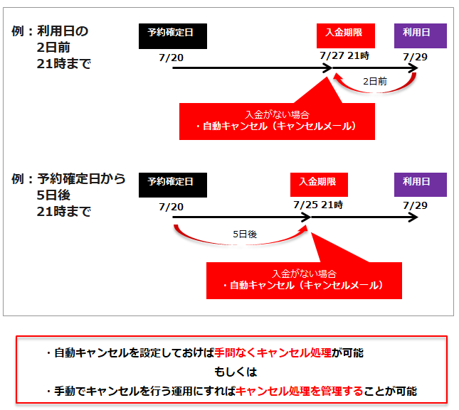 入金期限の設定でできること/入金管理・自動キャンセル(管理者向け) ■入金期限の設定でできること お支払いのステータス管理や、自動キャンセルなどの設定を行うことができます。 入金状態の方に対しての対応をシステムがサポートします。 ■入金管理 入金の有無を一覧で管理できます。 期限を過ぎても入金されていない予約はピンクの背景がつくようになっております。 ■自動キャンセル 設定しておけば期限までにお支払がない場合、予約を自動キャンセルします。 ※設定は任意です。自動キャンセルを設定せず管理者が手動でキャンセルすることも可能。
