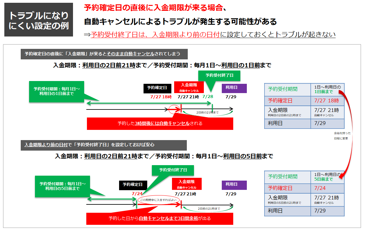 入金期限の設定と、入金依頼メール、自動キャンセルのパターンをご紹介します。