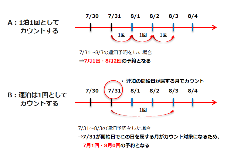 施設予約の回数制限/連泊のカウント方法は? 宿泊施設にて連泊利用の場合、連泊をどのようにカウントするか形態を選ぶことができます。 ■連泊のカウント方法 1泊を予約1回とカウントするか、 連泊した場合も予約1回とカウントするか、選択することができます。 <設定可能な項目> A:1泊1回としてカウントする B:連泊は1回としてカウントする