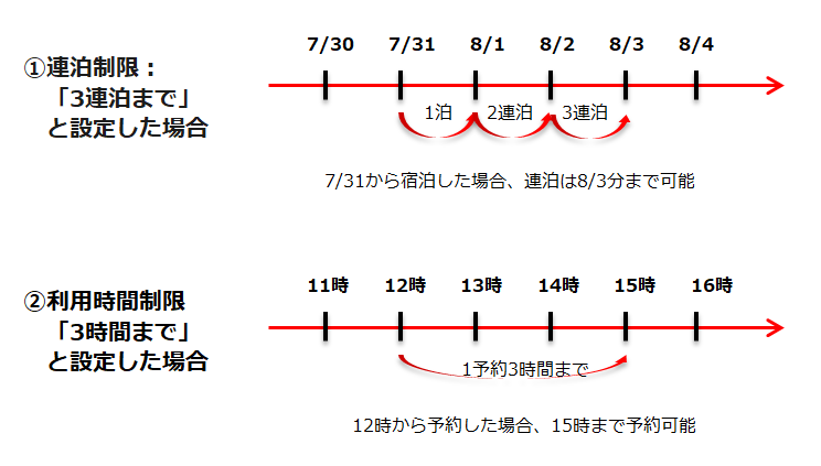 施設予約の連泊制限、利用時間制限とは? ■連続制限とは 施設の連続利用ができる泊数や時間を設定しておくことができる機能です。 宿泊予約と時間予約での設定が可能です。(1)連泊制限 連続で何連泊まで許容するか設定できます。 <設定可能な項目> ●連泊まで (2)利用時間制限 1回に予約できる 最大のコマ数または時間を設定しておくことが可能です。 <設定可能な項目> A:1予約あたり●コマまで B:1予約あたり●時間(●分)まで