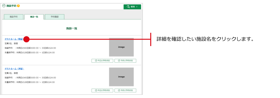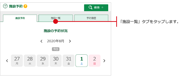 「施設予約」ページの「施設一覧」タブをクリックします。