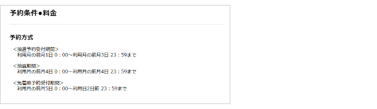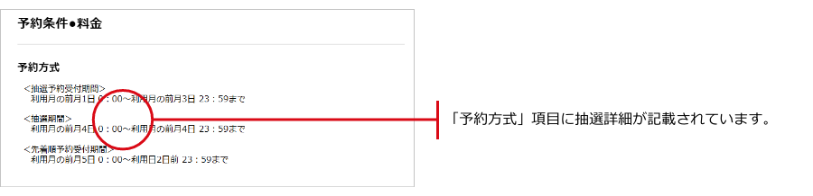 施設予約詳細ページの「予約方式」項目に抽選詳細が記載されています。