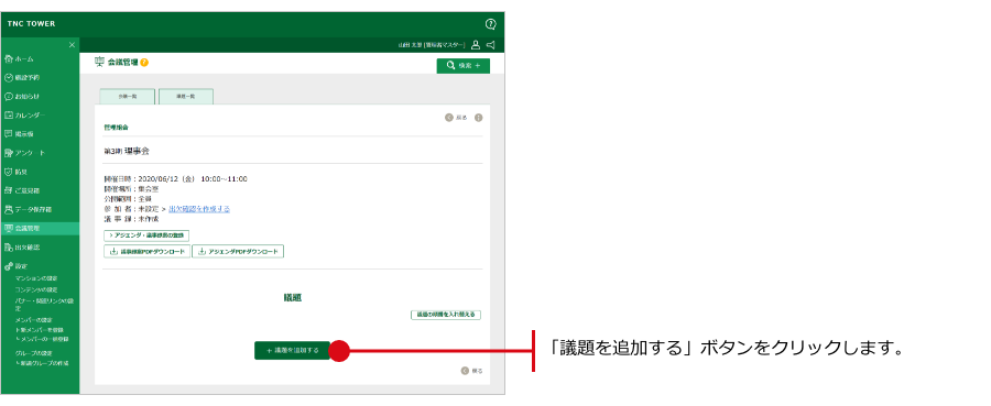 会議詳細ページにある「議題を追加する」ボタンをクリックします。