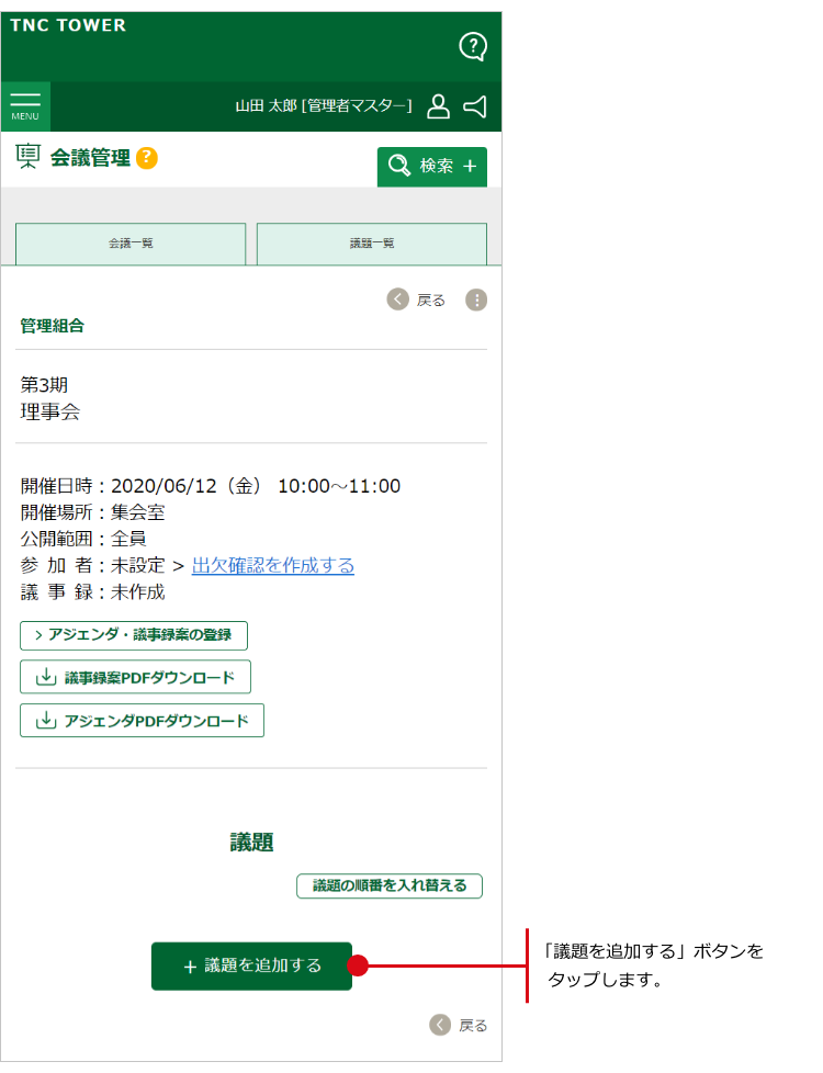 会議詳細ページにある「議題を追加する」ボタンをタップします。
