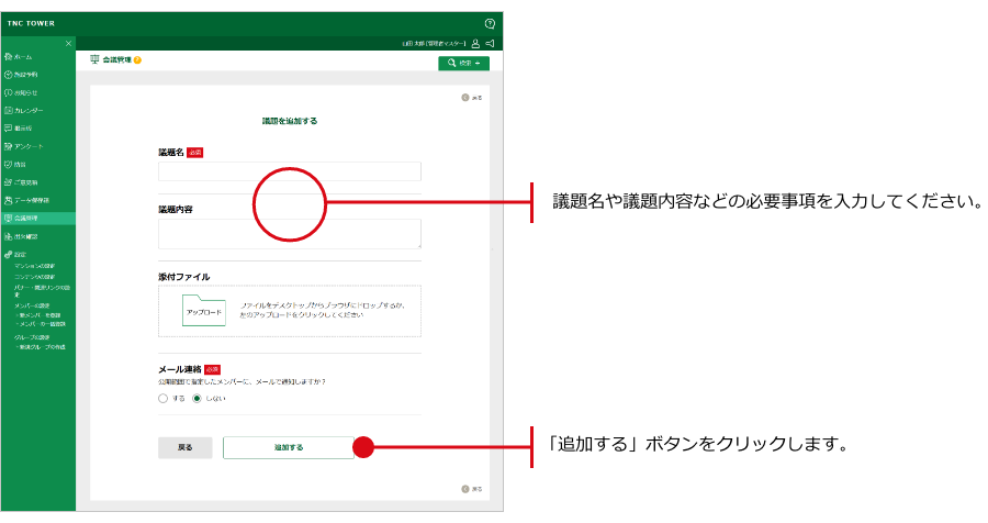 新規議題の入力画面が表示されるので、議題名や議題内容などの必要事項を入力し、