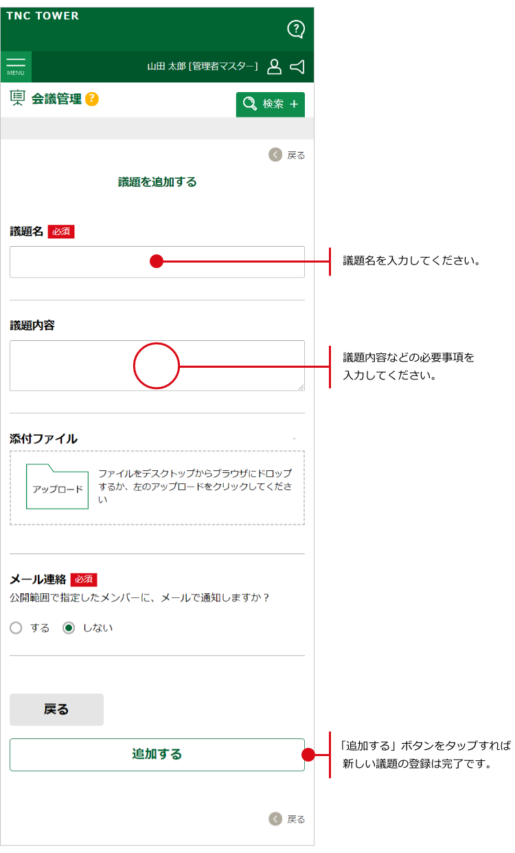 新規議題の入力画面が表示されるので、議題名や議題内容などの必要事項を入力し、「追加する」ボタンをタップすれば、新しい議題の登録は完了です。