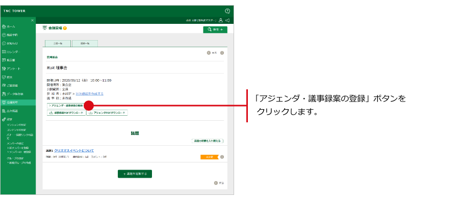 会議詳細ページにある「アジェンダ・議事録案の登録」ボタンをクリックします。