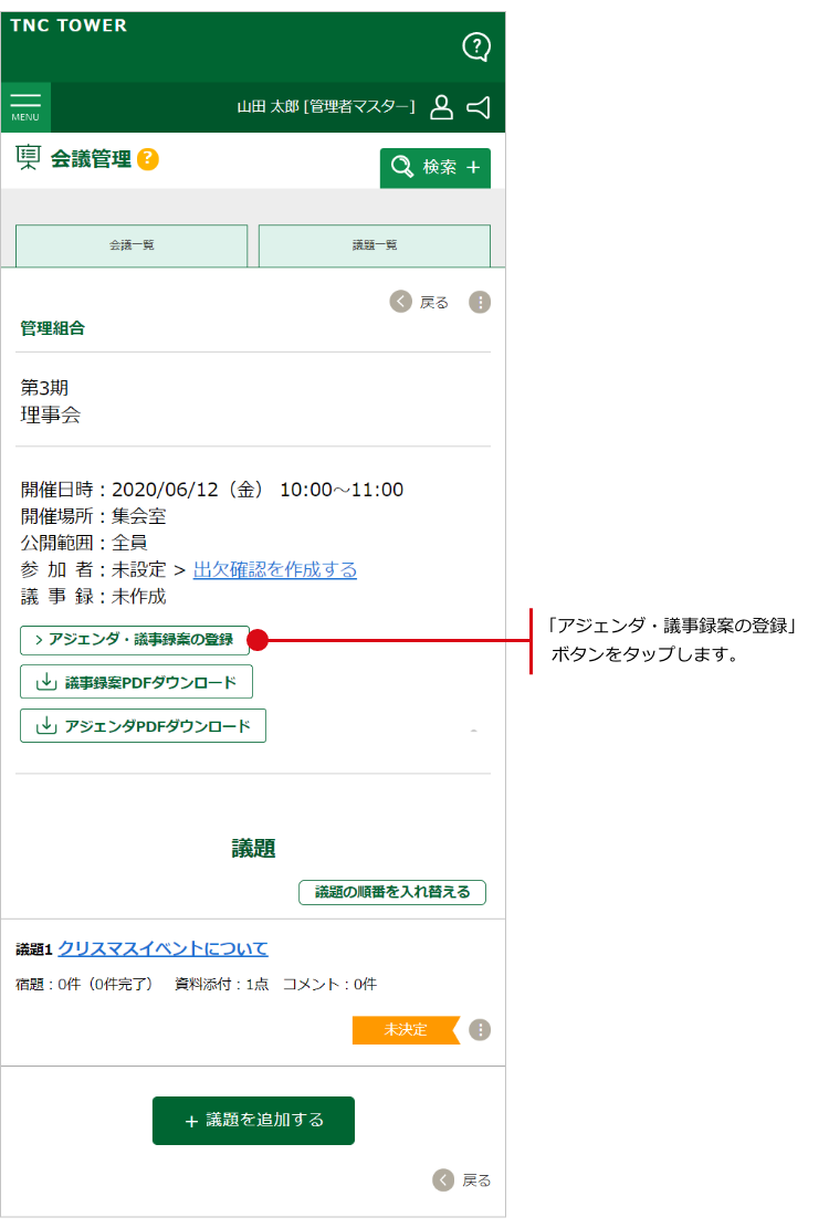 会議詳細ページにある「アジェンダ・議事録案の登録」ボタンをタップします。