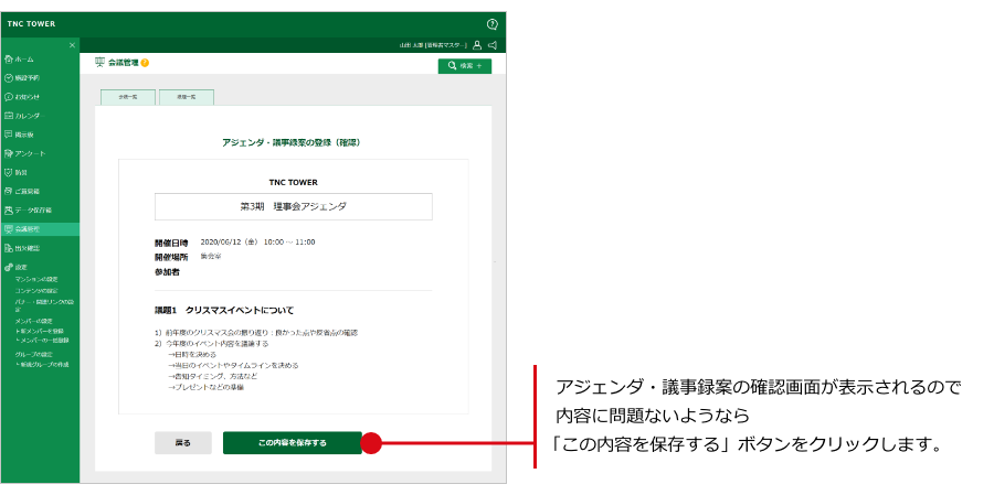 アジェンダ・議事録案の確認画面が表示されるので、内容に問題ないようなら