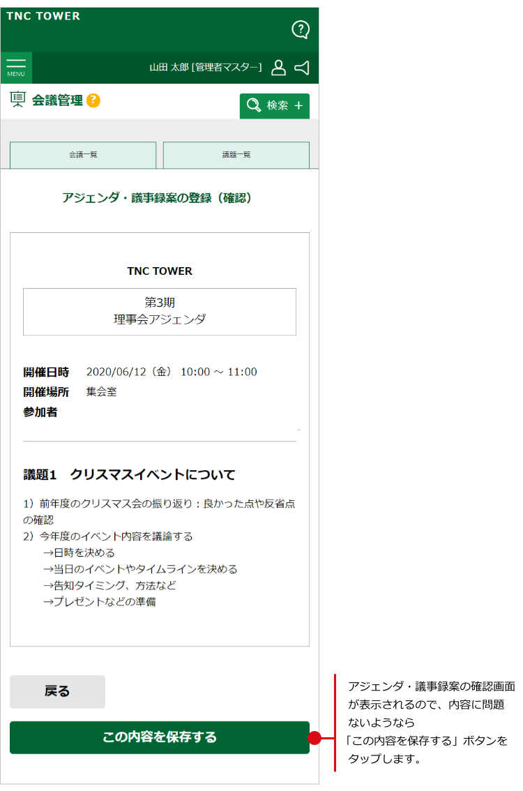 アジェンダ・議事録案の確認画面が表示されるので、内容に問題ないようなら、「この内容を保存する」ボタンをタップします。