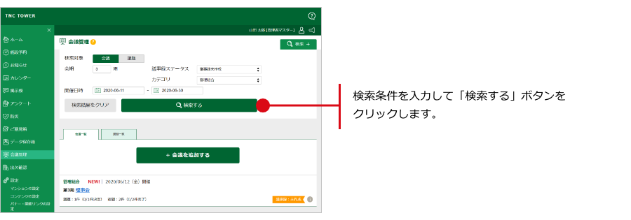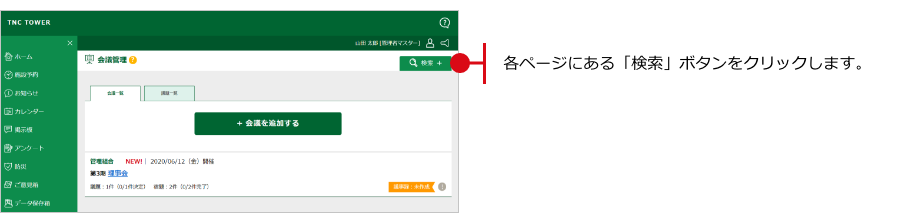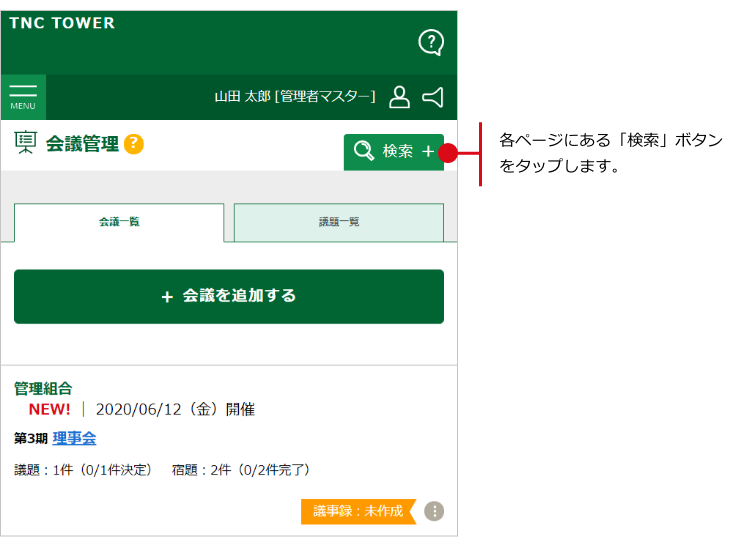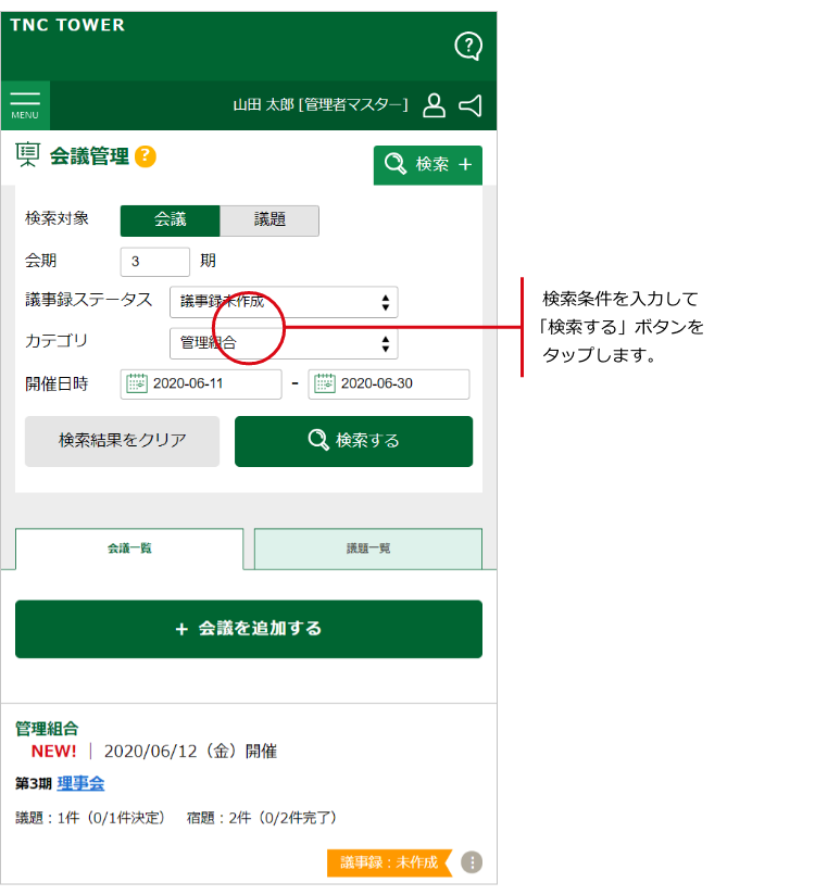 会議管理で過去の議論を参照(検索)する方法。 過去の議論を参照(検索)する手順をご案内いたします。 スマートフォンをご利用の方はこちらをクリック パソコンをご利用の方はこちらをクリック スマートフォンでの操作手順 ■ステップ1 各ページにある「検索」ボタンをタップします。 ■ステップ2 検索条件を入力して「検索する」ボタンをタップします。 パソコンでの操作手順 過去の議論を参照(検索)する手順をご案内いたします。 ■ステップ1 各ページにある「検索」ボタンをクリックします。 ■ステップ2 検索条件を入力して「検索する」ボタンをクリックします。