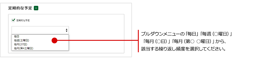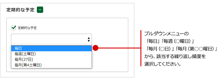 プルダウンメニューの「毎日」「毎週(○曜日)」「毎月(○日)」「毎月(第○ ○曜日)」から、