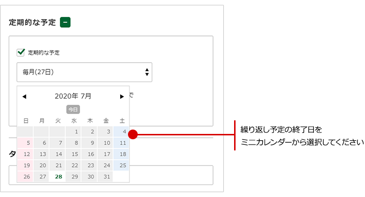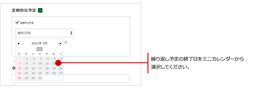 繰り返し予定の終了日をミニカレンダーから選択してください。
